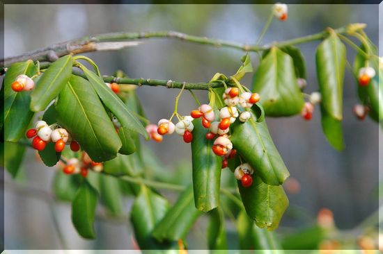 枯葉だらけの林の中で、こんな赤い実を見つけました。