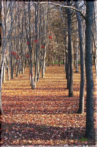 規則正しく並んだ木の陰が、落ち葉の絨毯に縞模様を作っていました。