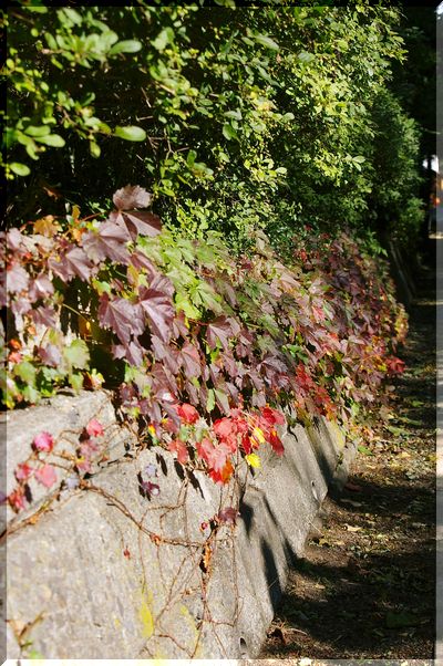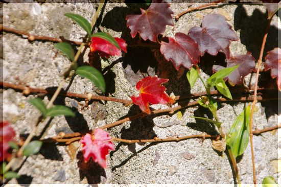 陽だまりの塀のツタ(?)も、赤くなってきました。