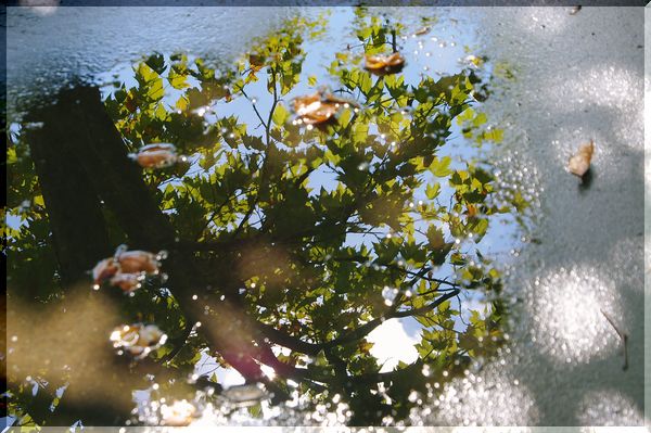 遊歩道の上に、今朝の雨の置き土産の水溜り。