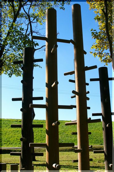 林の中の遊具が、オブジェのように見えます。