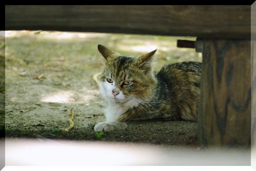 散歩中の猫ちゃん、ベンチの下の日陰で一休み♪