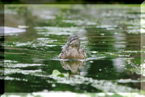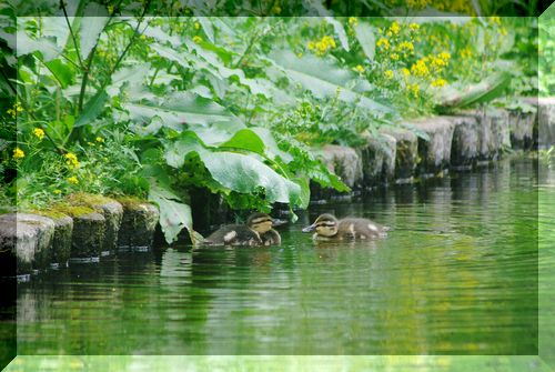 池にはカルガモの家族が住んでおり、