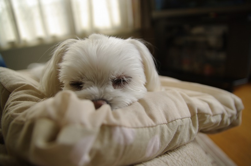 散歩から帰ってくると、あったかい布団の上でお休み~。