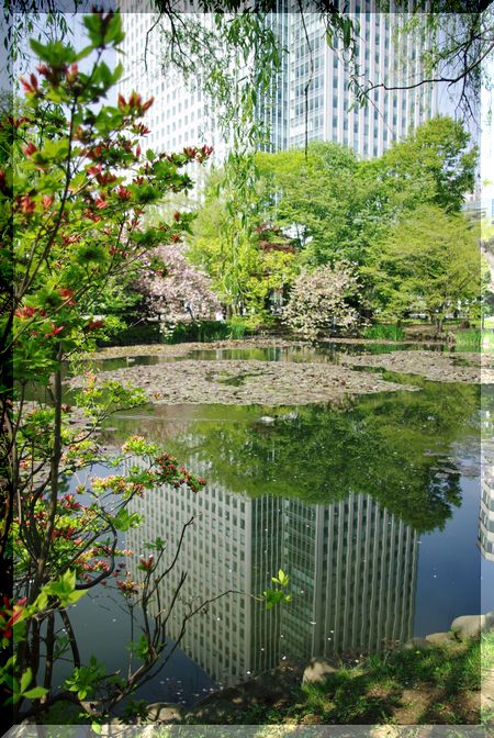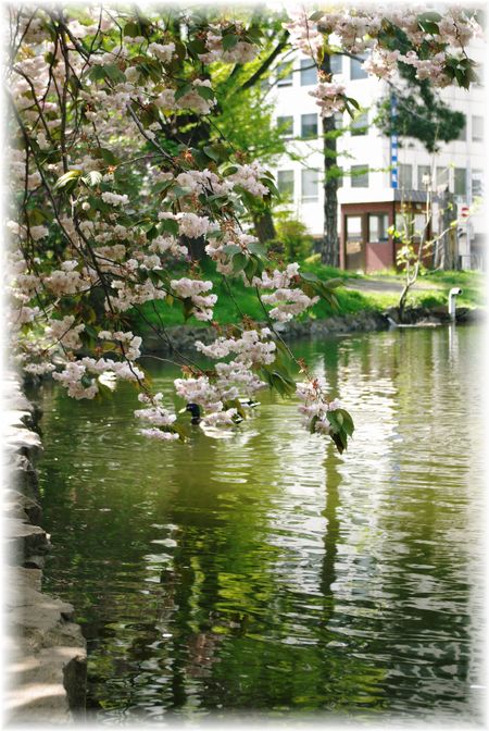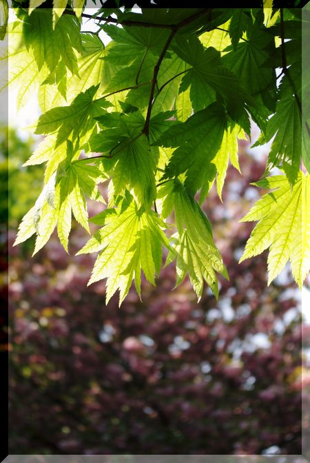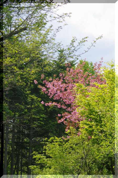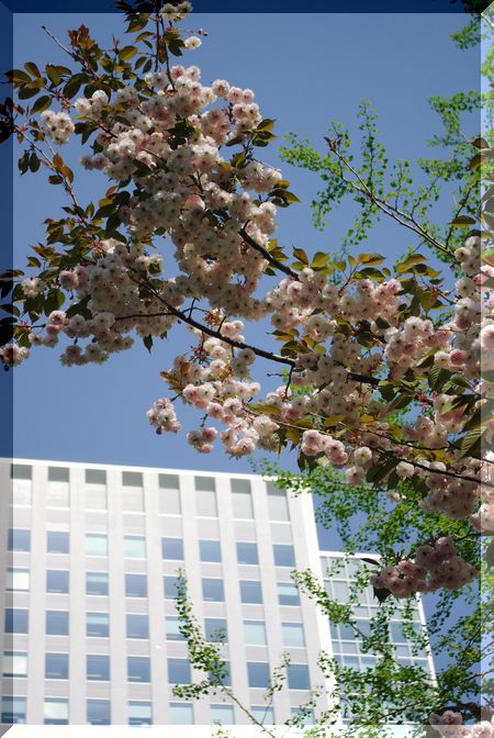 かえでの若葉の向こうには、八重桜が満開でした~♪