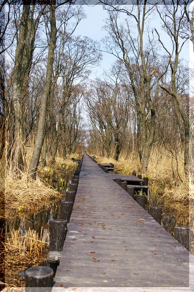水芭蕉の群生地は、この木道沿いに広がっています。