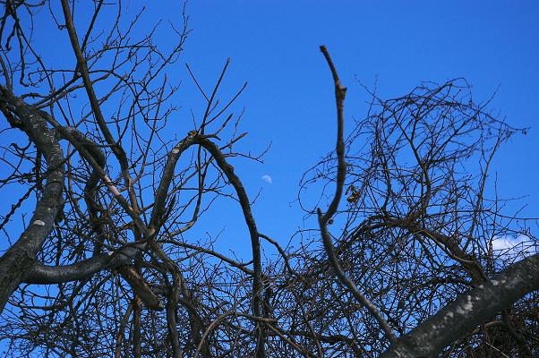 枝の間の青空に、ぼんやり月が浮かんでいます。