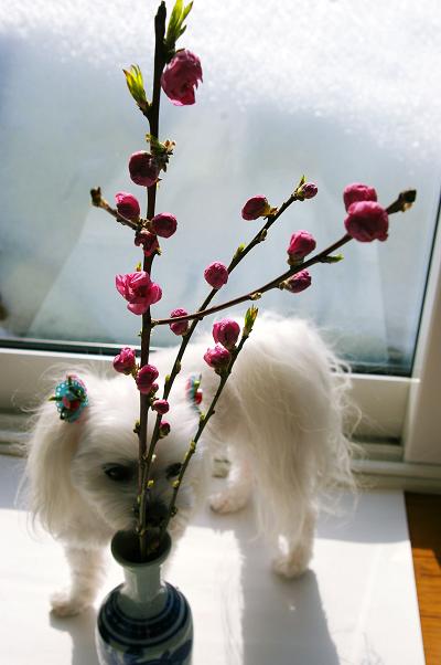 明後日はひな祭りなので、うちのお雛様にも桃の花を買ってきました。