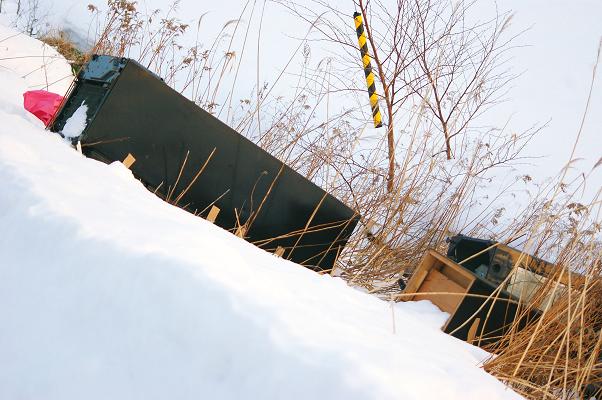冷蔵庫やテレビ台、いくつかの家電のようなものが捨てられてます。