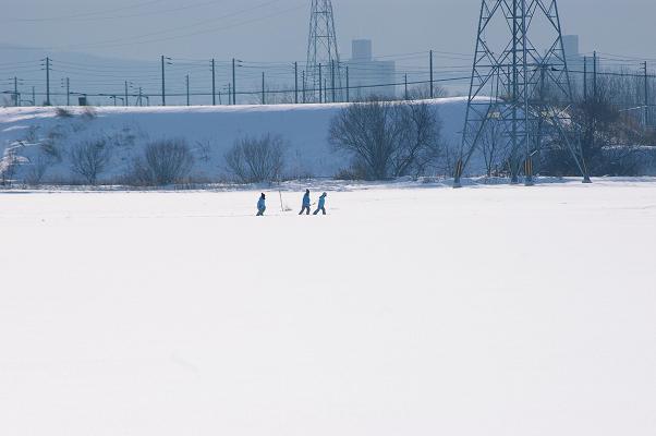 一面雪景色の牧草地では、子供達が歓声を上げながら