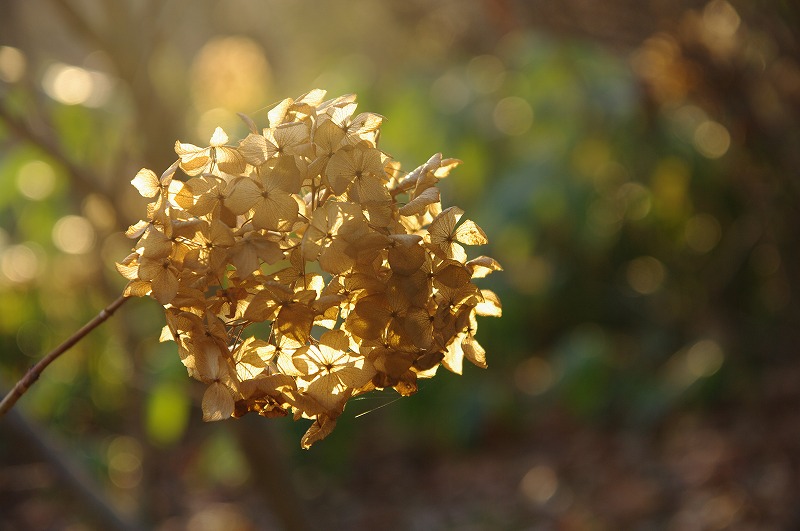 ドライフラワーになったアジサイが、金色に輝いてました。