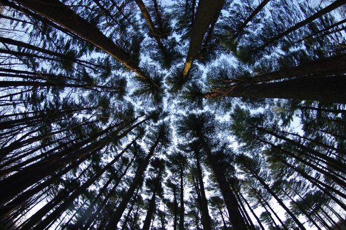 杉木立を見上げながら、森の朝の気配を独り占め♪