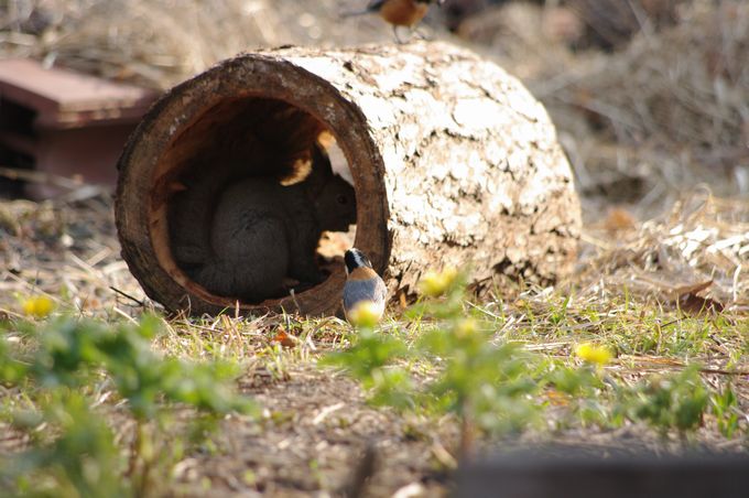ヤマガラさん、ご飯を食べてるエゾリスさんが気になるようで・・