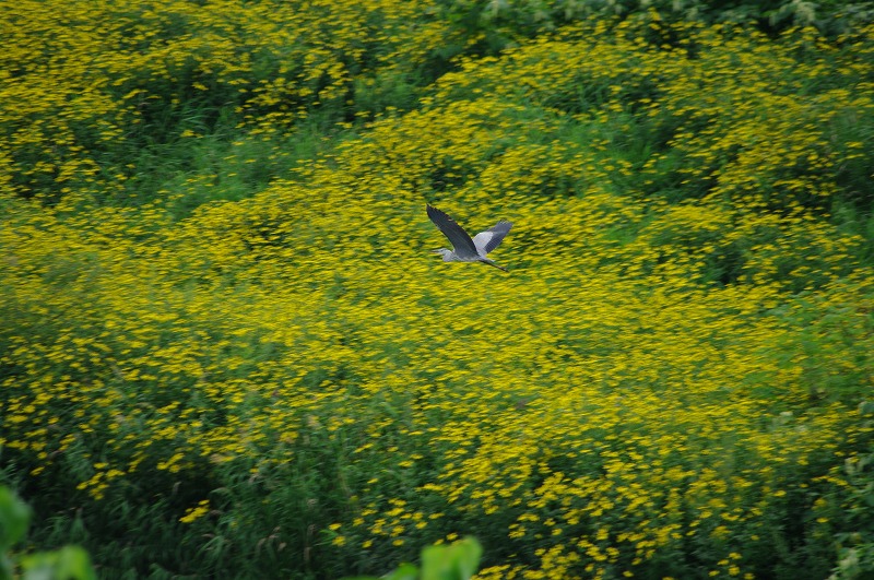 帰り道、黄色のオオハンゴウソウが繁茂する川原を眺めていると、