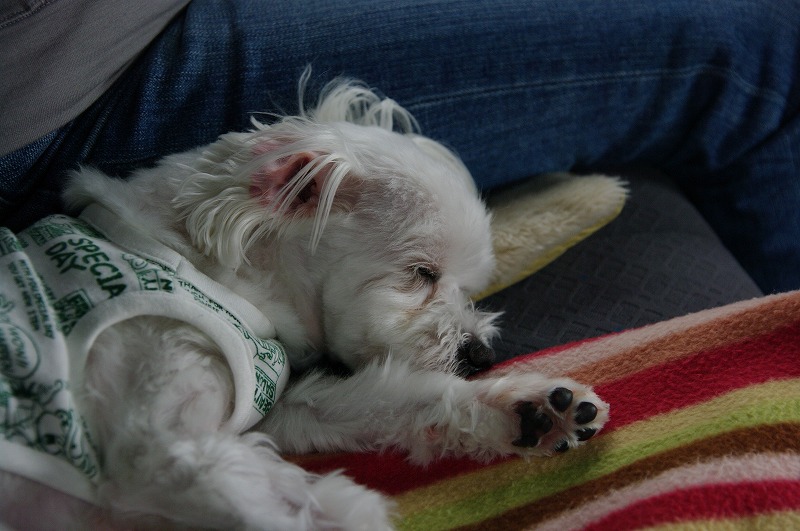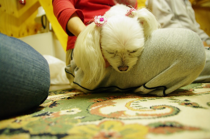 終いには、マル吉お母さんの膝の上で爆睡してるし・・・。