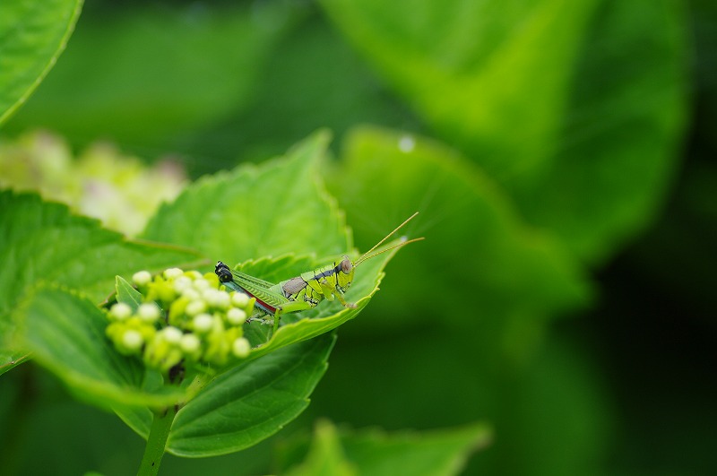 このバッタ、よく見ると緑と黒と赤と青の4色が、