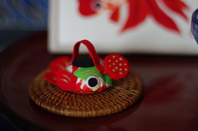 後ろの赤い金魚は、和紙の上に古布を貼り付けてあります。