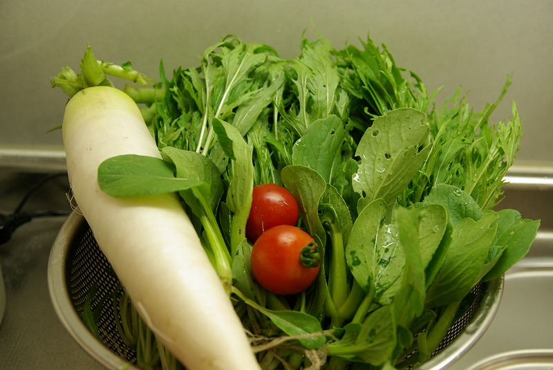 ミニトマト2個、虫に食べられ放題のミニ青梗菜とミズナ。