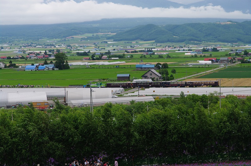 ラベンダーの畑の向こうに、ちょうど「ノロッコ号」がやってきました。