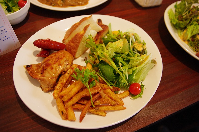 オーナーの手作りパンとチキン、ポテトにサラダ、ソーセージが、