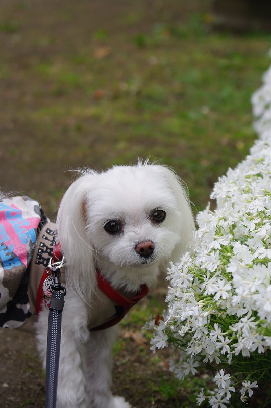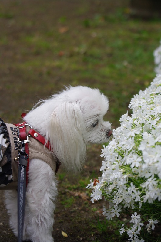 公園の花壇で、芝桜のかほりを嗅いでるマミ。