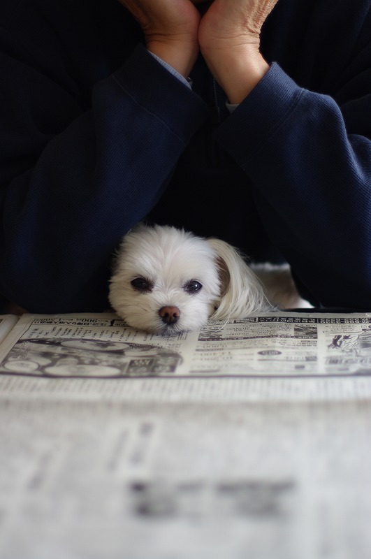 新聞を読む父の膝の上で、朝からマッタリですよ。