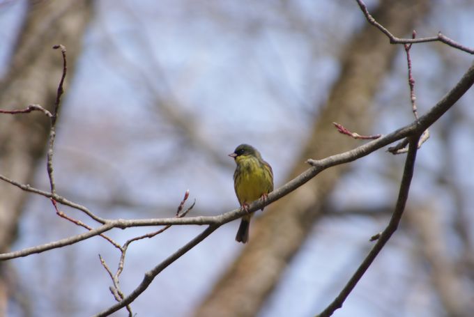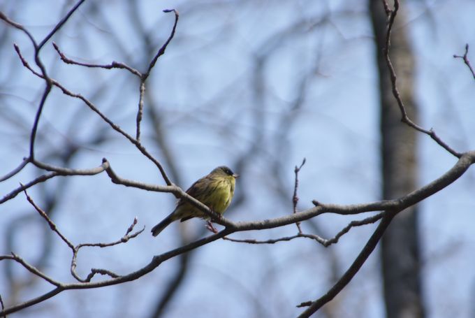 目の前の木に止まったアオジが、