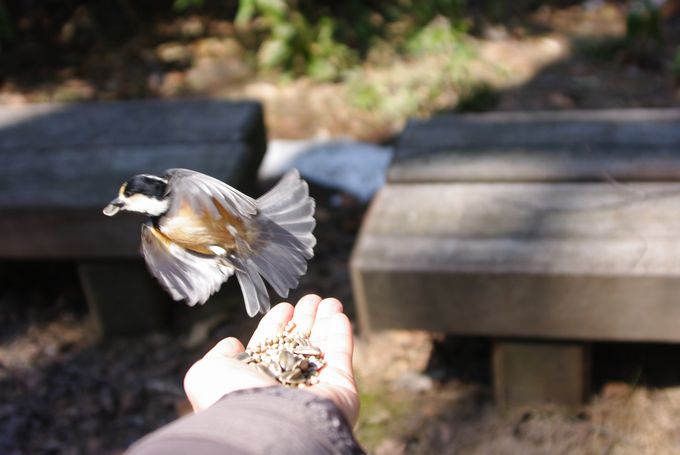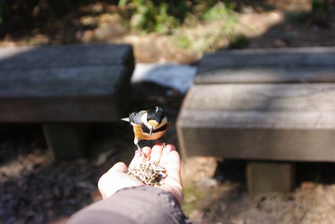 腕が疲れたので、餌をベンチの上に置いて、さよならしてきました~(笑)