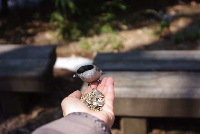 いつもの東屋で小鳥達に餌をあげている人がいました。