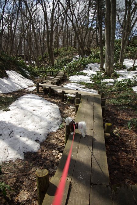 やっと雪の下から出てきた木道を、