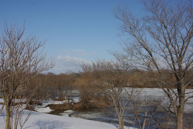 まだまだ冬景色のわが町の沼には、数羽のカモたちがいるだけでした。