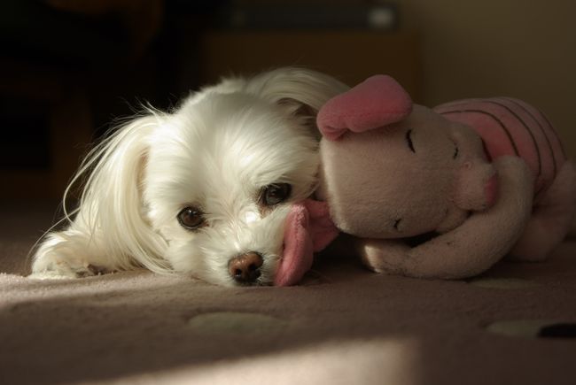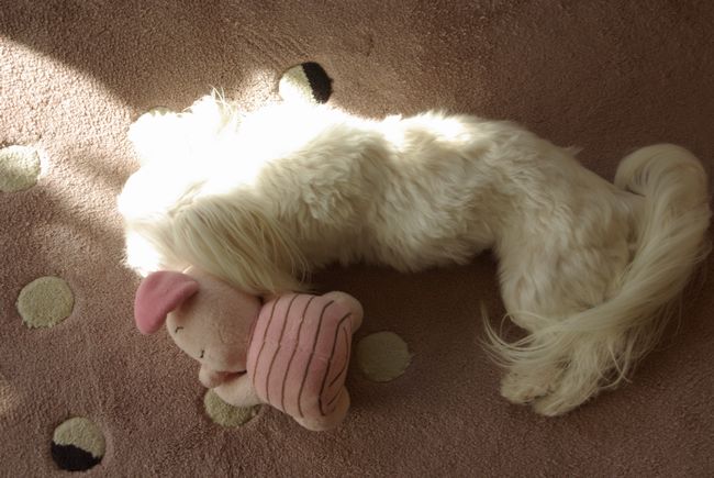散歩から帰ってくると、大好きなブタさんと一緒に一休み。