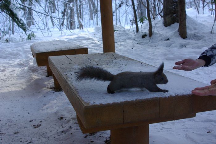 東屋で一休みしていたら、小鳥とリスのためにと、