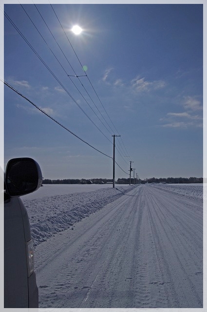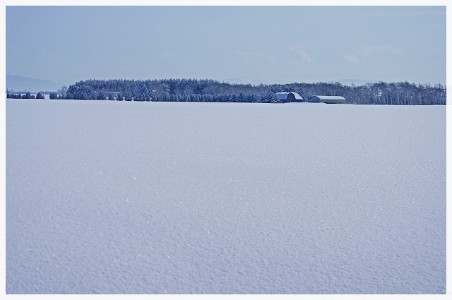 前日降った雪を被った防風林の風情がいい感じ。