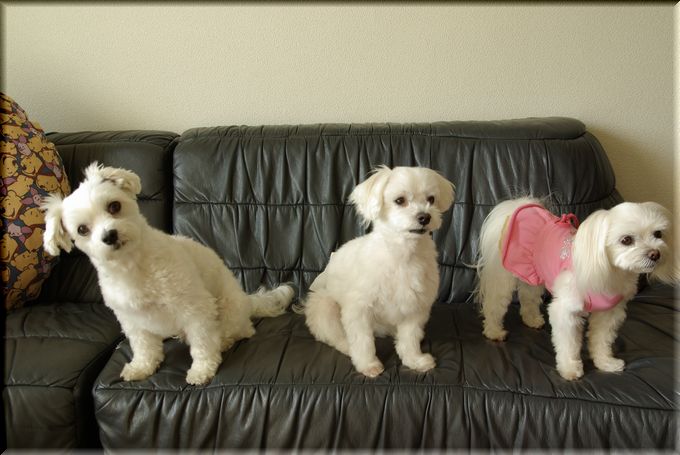 3ワン並べて座らせると、ちょっと遠慮気味なマル吉君。