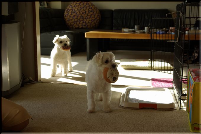 お気に入りのおもちゃをくわえる、マル吉君とナナ君。