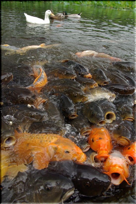 がっつく鯉とは対照的な、アヒルさんたち・・。
