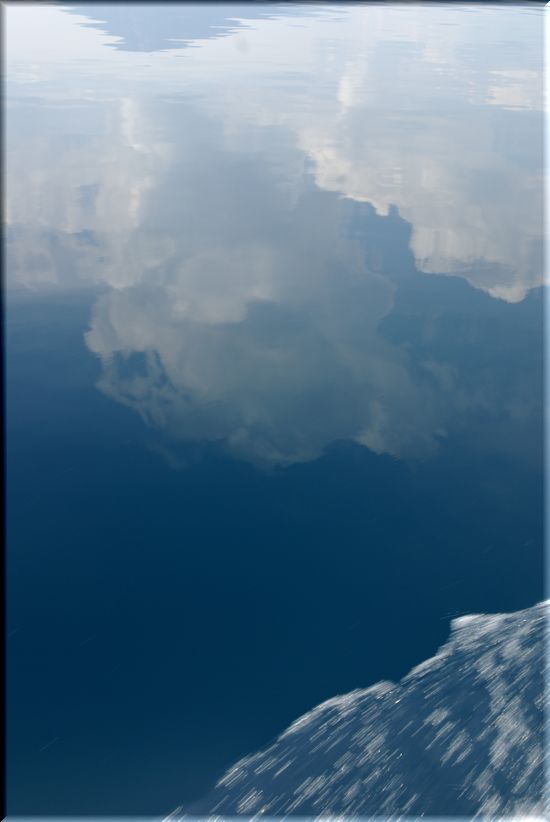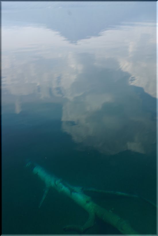 湖底の倒木と、湖面に映る雲・・・。