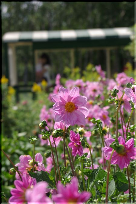 ダリアの向こうには、「リリートレイン」が通り過ぎていきます。
