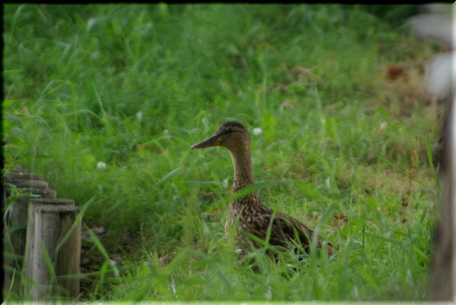 遊歩道を歩いていると、散歩中のカモさんに出会いました(笑)