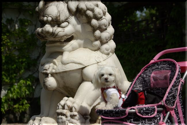 中国庭園の前の、白い大きな狛犬(?)さんと一緒に~♪