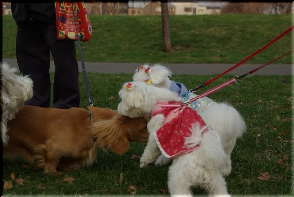ダックスちゃんとご挨拶中のりんちゃんとナナ君。