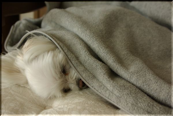 さんざん荒れた後は(爆)、父のフリースをかぶっておネンネです♪