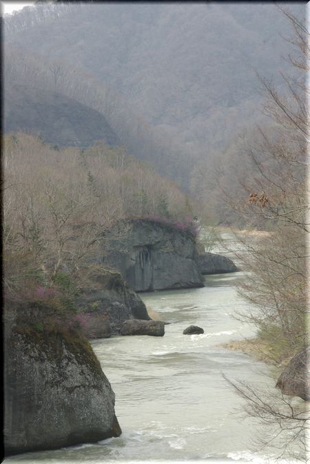 橋の下には、雪解けの水が加わって勢いを増した川が流れてました。