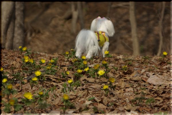 福寿草の群生の向こうには、白い子が・・・("⌒∇⌒")