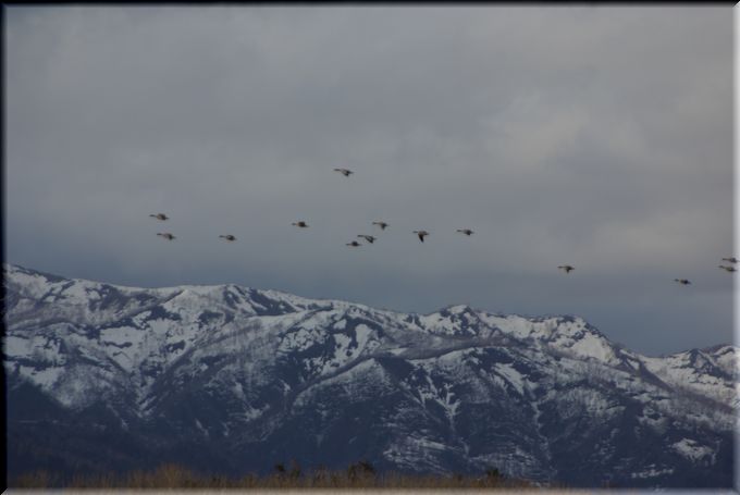 雪の山を背景に飛んでるマガン・・・ピンボケです・・(涙)
