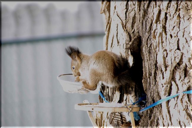 リスはすっかり慣れていて、おば様が餌台に餌を置いてやると