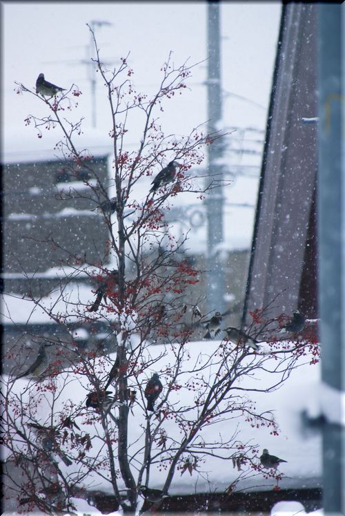 降りしきる雪・・・薄日がさして、小鳥のシルエット♪