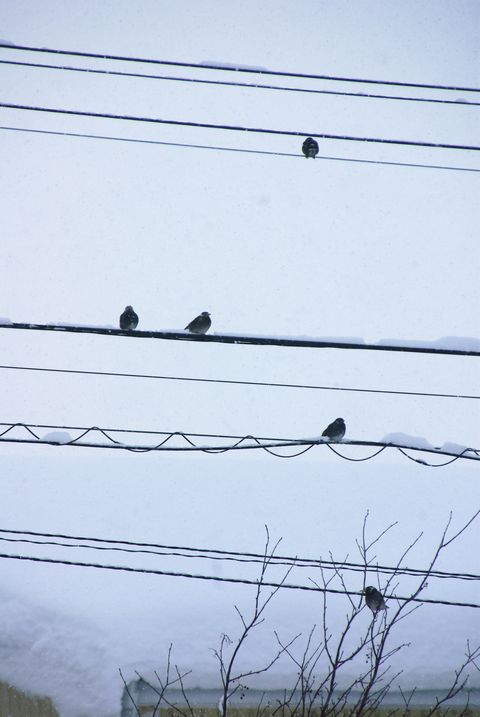 雪の積もった電線に並ぶ鳥達、♪(おんぷ)みたいでしょ~(笑)