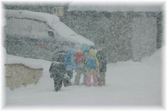 激しい雪の中、学校から子供達が帰ってきました。